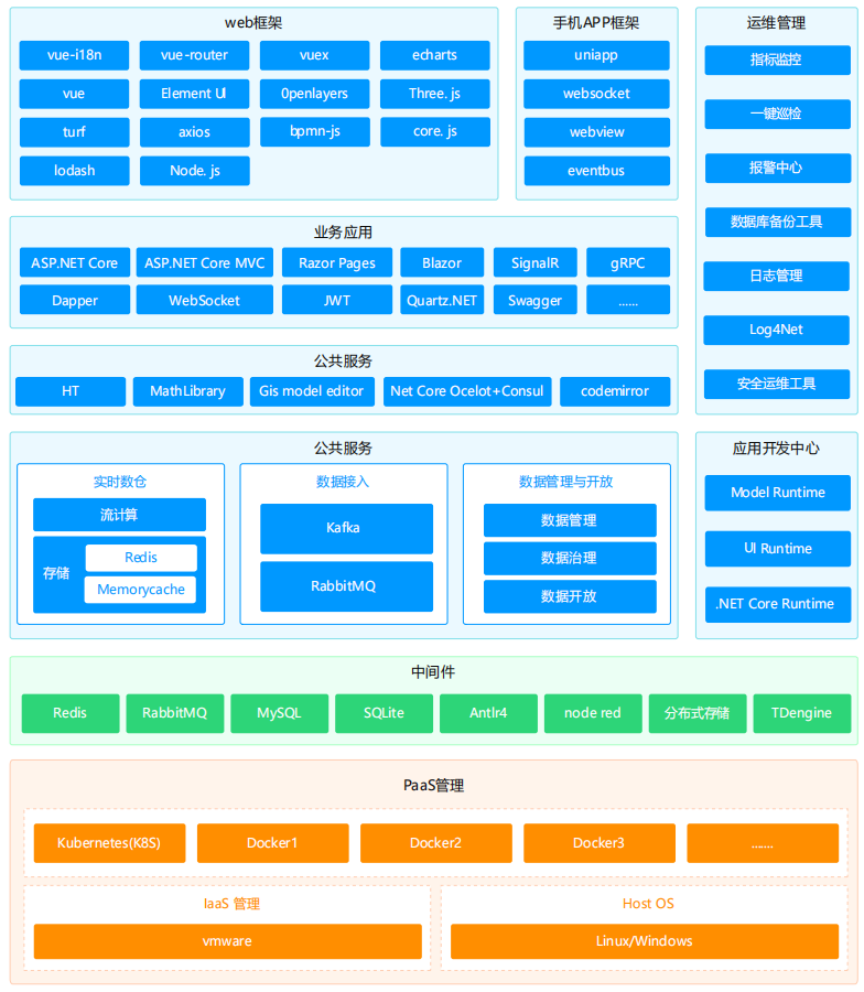 公共服務:分別實現前端可視化頁面編排、WebAPI接口編排、流程編排、規則配置、2D/3D建模渲染、融合定位接入管理、視頻接入管理。