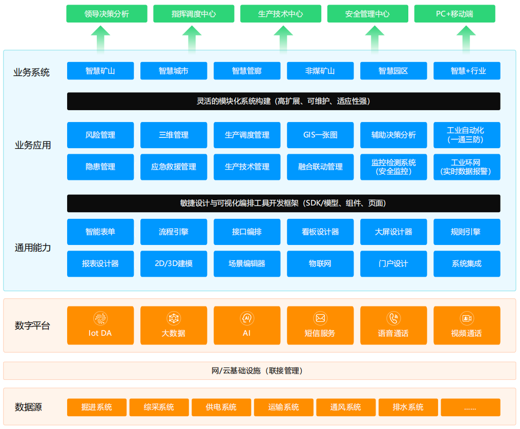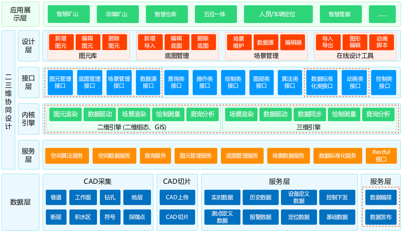 支持C/S和B/S架構,通過復雜地質自動三維建模、模型網格剖切、模型動態更新、海量數據采集管理等關鍵技術,為礦井地質數據的可視化共享、動態修正、智能開采、智能掘進、智能管控、安全生產、地質災害預警等提供服務和指導依據。
