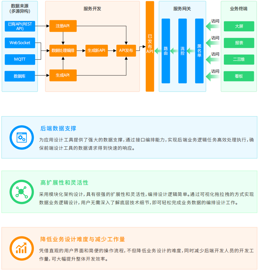 支持多源異構數據源的統一接入與管理,實現異構數據的無縫集成,通過數據編排處理能力,可對接口返回的數據進行過濾、轉換、聚合等操作。以低代碼、高擴展能力實現高效、靈活的數據集成與處理,顯著降低數據集成復雜度,滿足各種場景下業務數據處理需求,助力企業快速構建、管理和發布標準化數據服務。