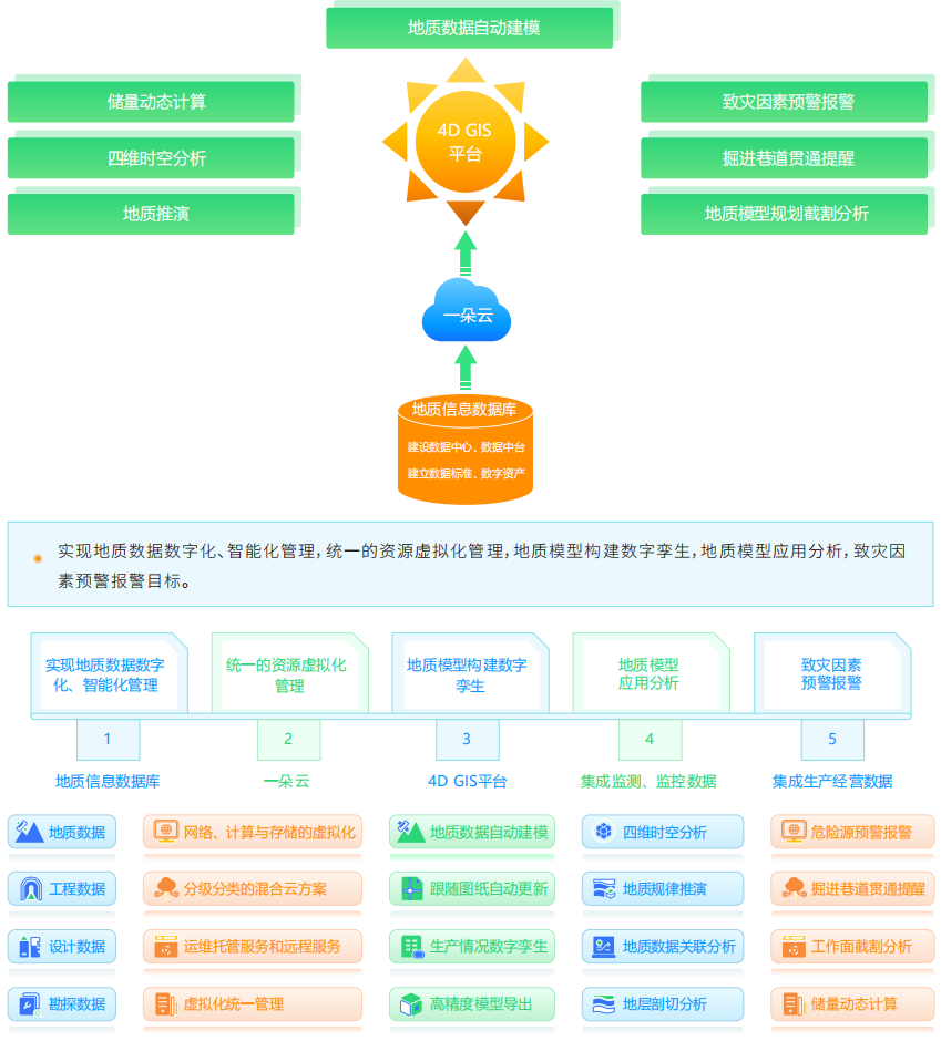 實現地質數據數字化、智能化管理,統一的資源虛擬化管理,地質模型構建數字孿生,地質模型應用分析,致災因素預警報警目標。