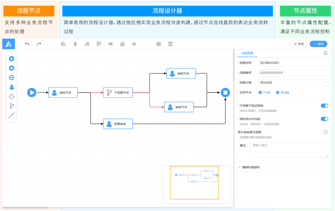 流程引擎實現企業級業務流程的自動化、標準化和智能化管理,全流程留痕滿足審計與內控要求,減少人工干預,流程處理效率提升50%以上。通過圖形化界面快速設計復雜業務流程,支持多級審批、并行會簽、條件分支等場景,包括審批人(固定/動態)、抄送人、表單權限、操作按鈕等,滿足企業多角色協作需求。