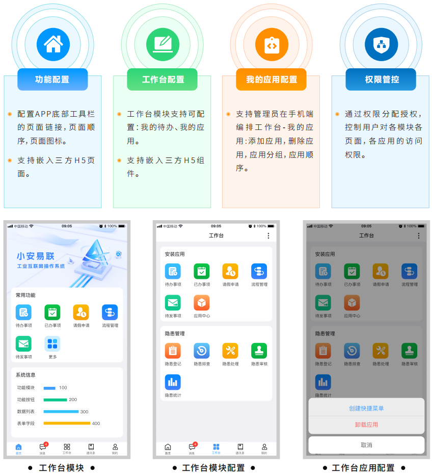 移動APP作為業務移動處理終端,提供數據填報、待辦任務處理、工作協同、消息推送相關功能,致力企業打造高效協同作業團隊。作為場景化移動應用入口,統一承載作業應用,隨時隨地的數字化作業支撐,且可通過靈活配置,滿足不同企業的個性化需求。通過提供的SDK能力,支持三方APP集成接入,獲取即時通訊,系統消息推送,工作臺頁面管理等服務,快速集成三方H5應用。