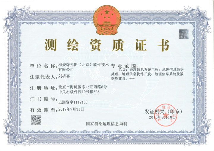 近日,北京市規劃和國土資源管理委員會根據《中華人民共和國測繪法》和《測繪資質管理規定》對梅安森元圖的技術力量、人員狀況、相關軟件產品等情況進行了全面審核,認為各項條件均符合相關標準要求,梅安森元圖通過了乙級測繪資質審批,喜獲乙級《測繪資質證書》,證書編號為:乙測資字1112153。